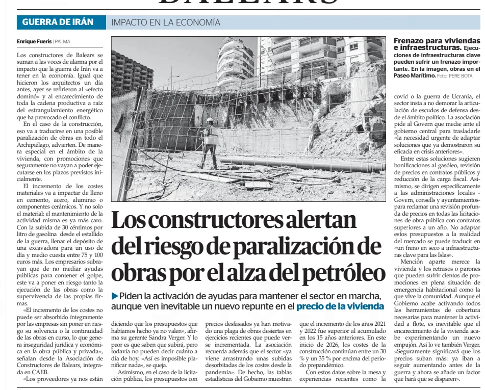 Menorca, Es Diari : Los constructores alertan del riesgo de paralización de obras por el alza del petróleo