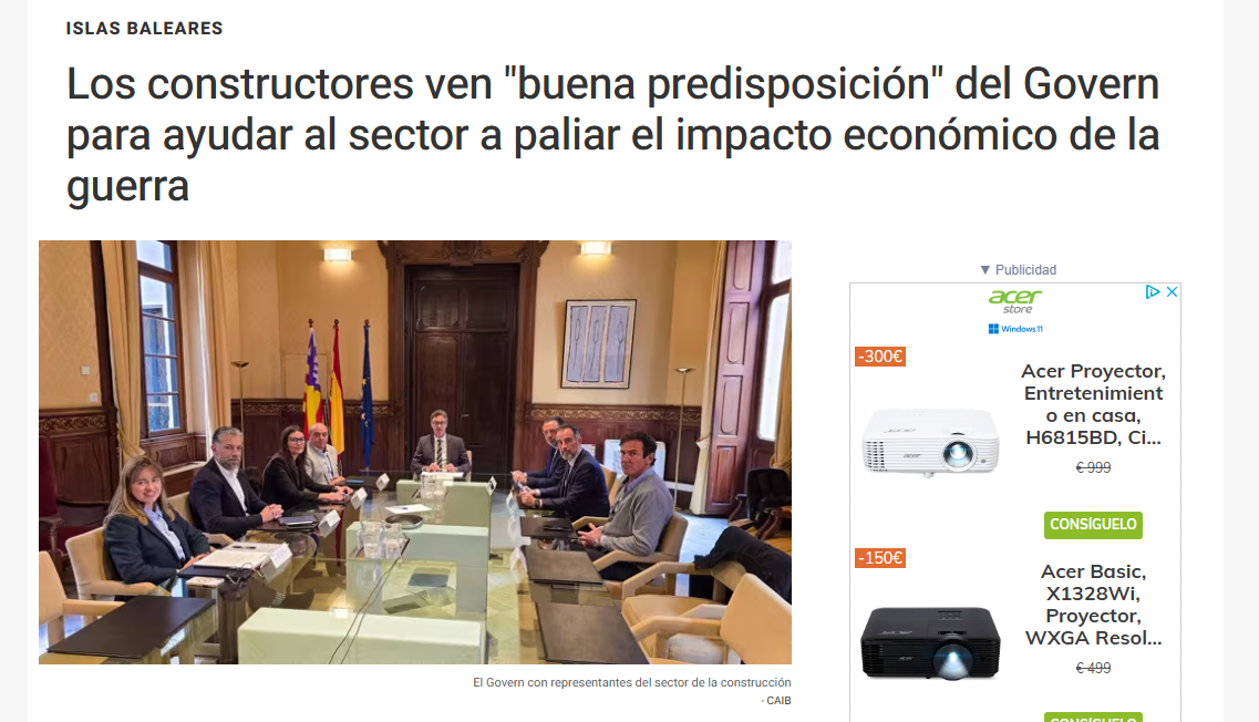 Europa Press: Los constructores ven «buena predisposición» del Govern para ayudar al sector a paliar el impacto económico de la guerra